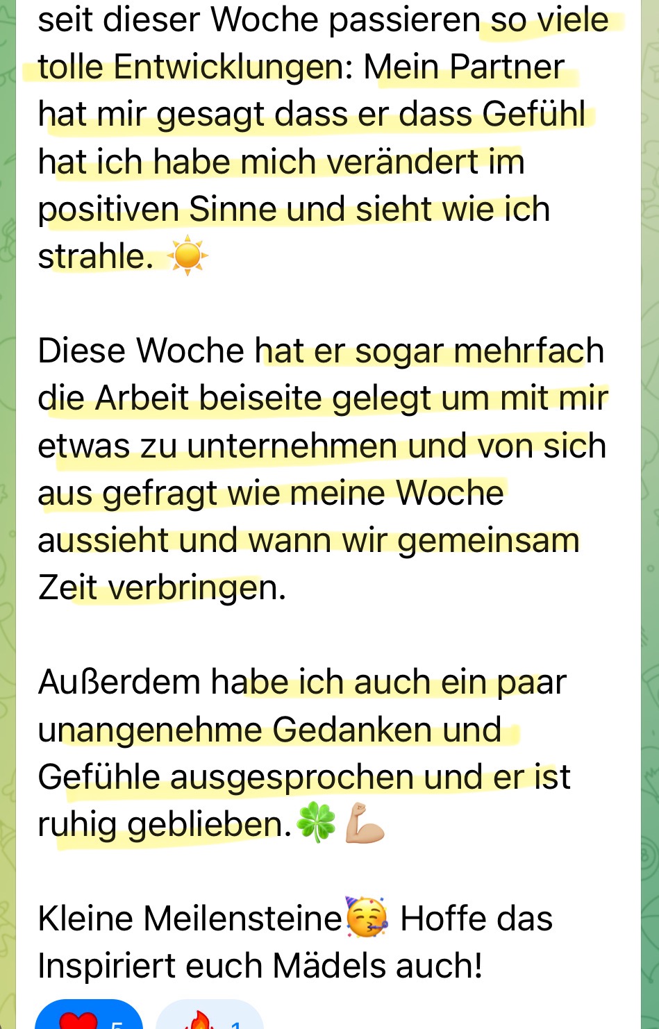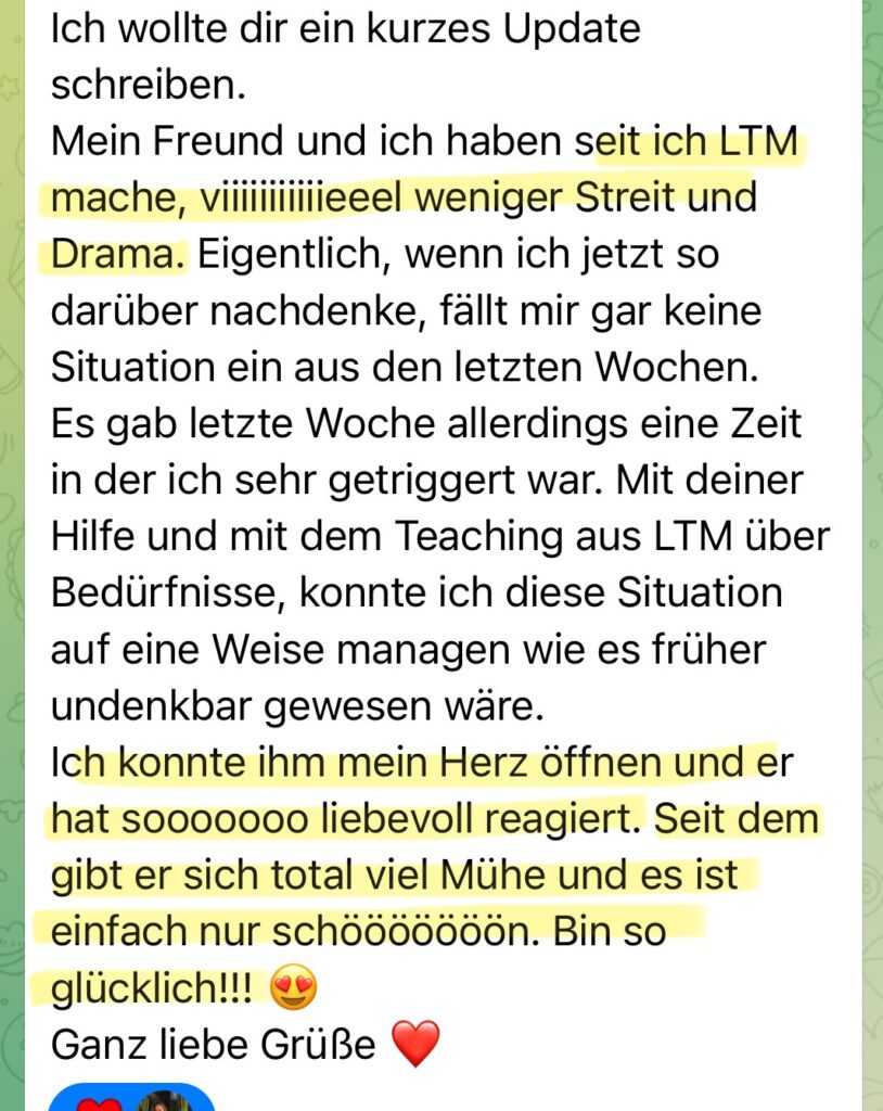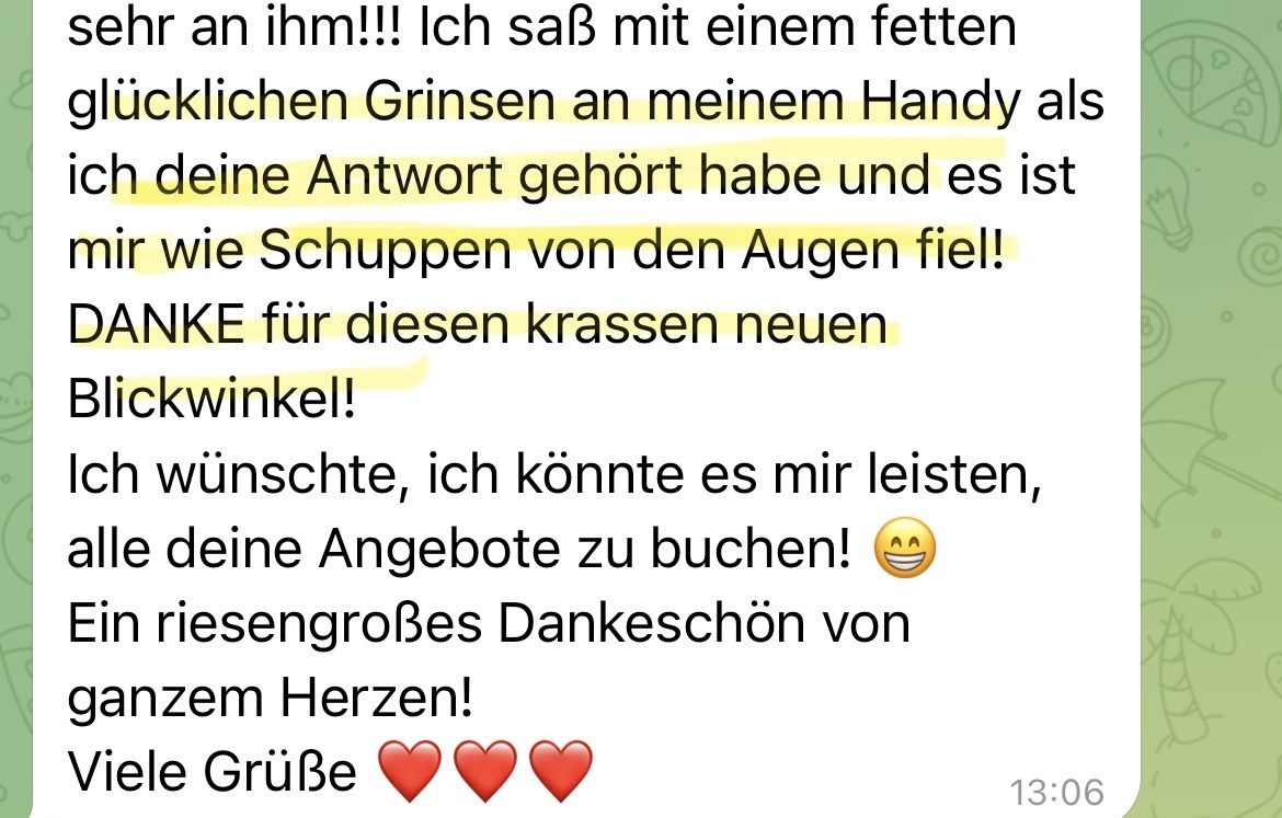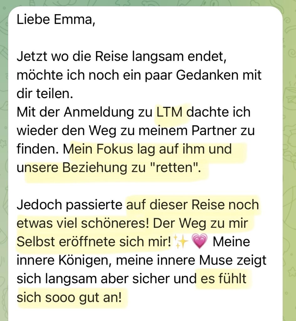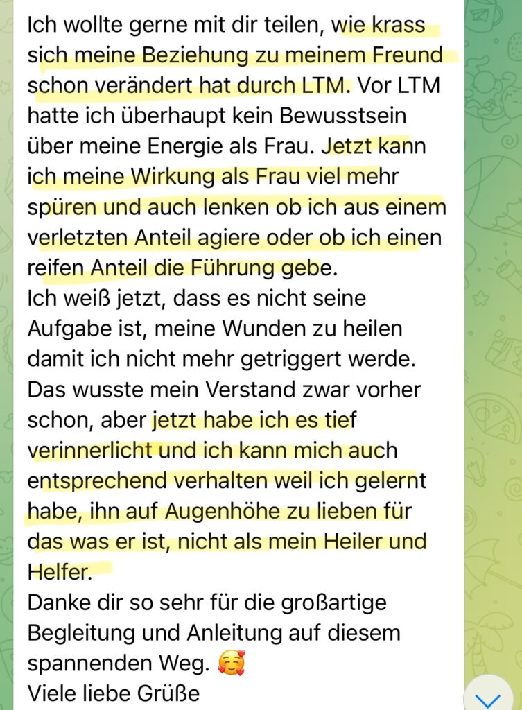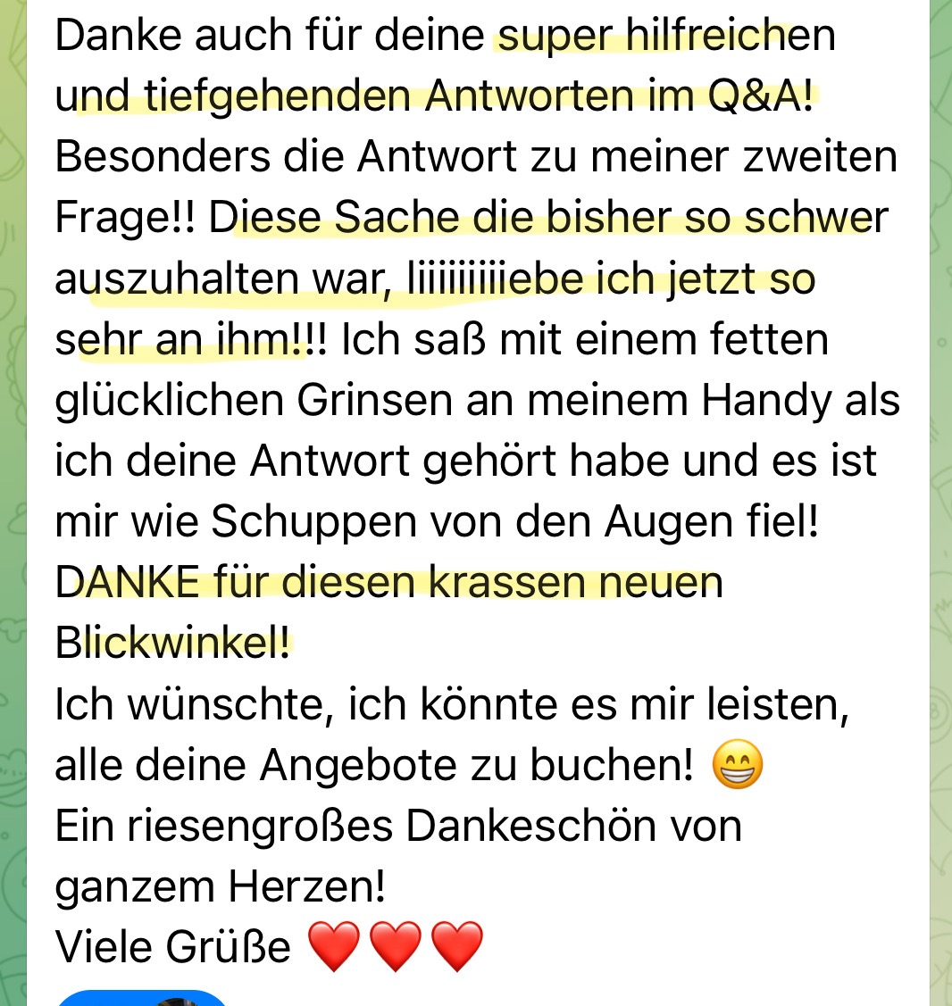 Du bekommst Zugang zur ursprünglichen Telegram-Gruppe von Loving & Trusting Men – inklusive der kraftvollen Q&A-Session aus der Live-Version.