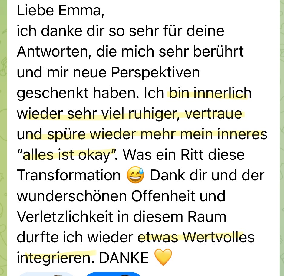 Nicht direkt im Kurs. Wenn du dir persönliche Unterstützung von mir wünschst, melde dich bei info@emmacosta.de und wir schauen welche Option am besten für dich passt.